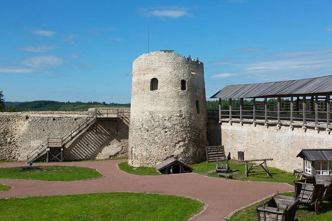 - Изборская крепость XIV в. на Жеравьей горе с романтическими названиями башен: Луковка, Вышка, Темнушка, Рябиновка. Крепость служила неприступным форпостом на подступах к Пскову. Не случайно в Ливонских хрониках её назвали «Железным градом». Вокруг раскинулась удивительная по своей красоте Изборско-Мальская долина – настоящая отрада для глаз жителя современного мегаполиса: лебеди на Городищенском озере, Словенские ключи, Труворово городище. Колоритен облик купеческого Изборска начала ХХ века и современной деревни, хранящей типовую застройку с хозяйственными постройками из известняка.